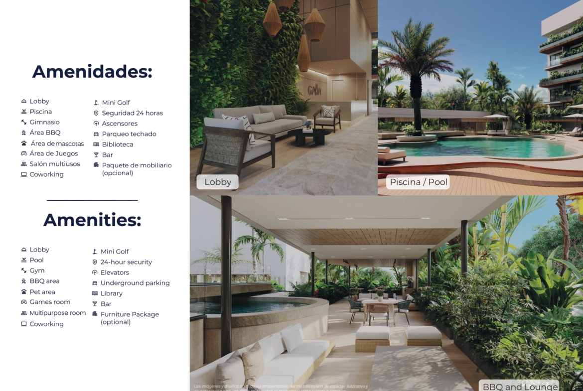 Enjoy breathtaking views of the pool, lush gardens, serene sea, and the renowned Las Iguanas golf course from select units. The social areas are designed for ultimate enjoyment, featuring a refreshing pool, a cozy BBQ lounge area, mini-golf facilities, and a dedicated pet space.