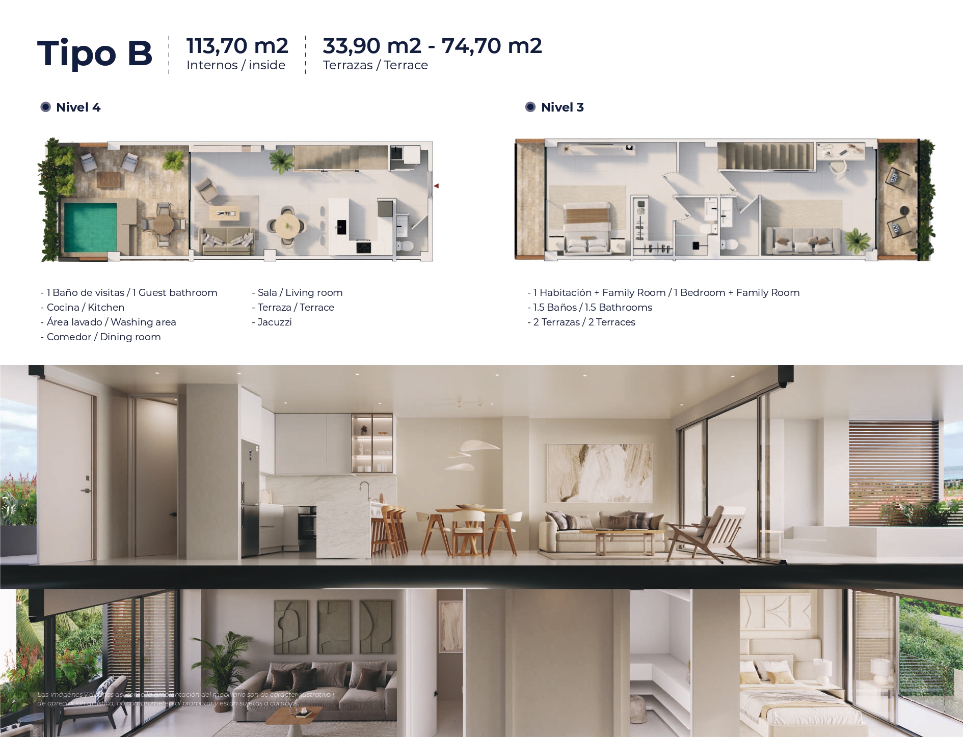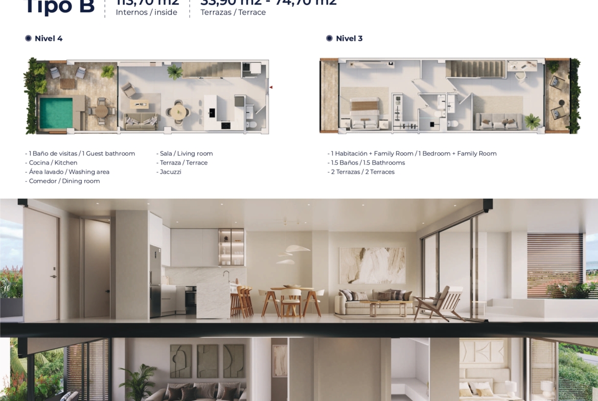 Introducing Galia at Cap Cana, a prestigious development offering 51 luxury apartment units. These units include 1 bedroom Family Room configurations and 2 bedrooms, each accompanied by a service room or locker for added convenience. Spanning across two levels, every residence boasts a private ”picuzzi” for indulgent relaxation.